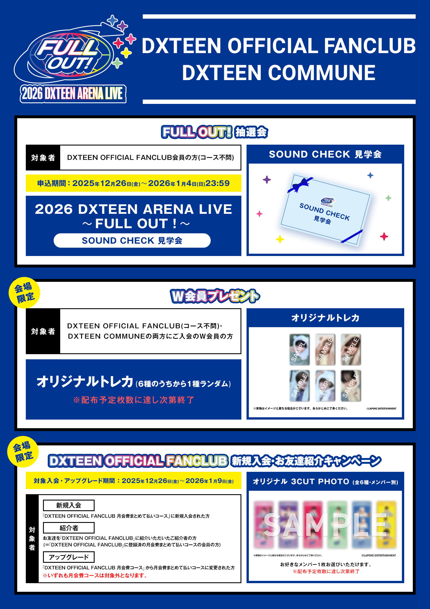 2025年12月26日(金)~2026年1月9日(金)に「DXTEEN OFFICIAL FANCLUB 月会費まとめて払いコース」に新規入会された方、およびお友達を「DXTEEN OFFICIAL FANCLUB」にご紹介いただいた月会費まとめて払いコース会員の方、そして月会費コースから月会費まとめて払いコースにアップグレードいただいた方かつ【公演当日FANCLUB BOOTHにお越しいただいた方】に、ここでしか手に入らないオリジナル3CUT PHOTOをプレゼント!