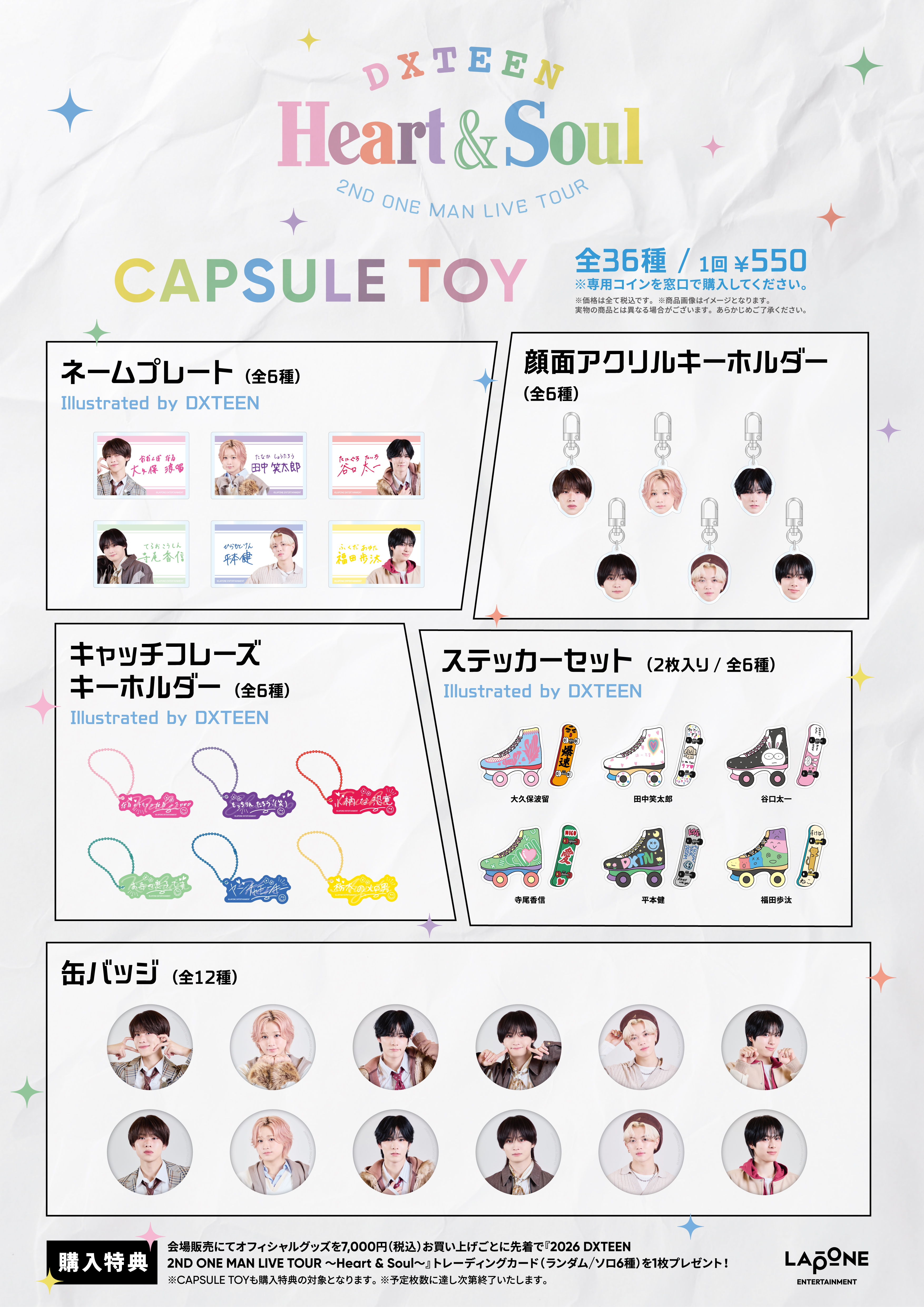 ◎会場販売にてオフィシャルグッズを7,000円(税込)お買い上げごとに先着で『2026 DXTEEN 2ND ONE MAN LIVE TOUR 〜Heart & Soul〜』トレーディングカード(ランダム/ソロ6種)を1枚プレゼント!