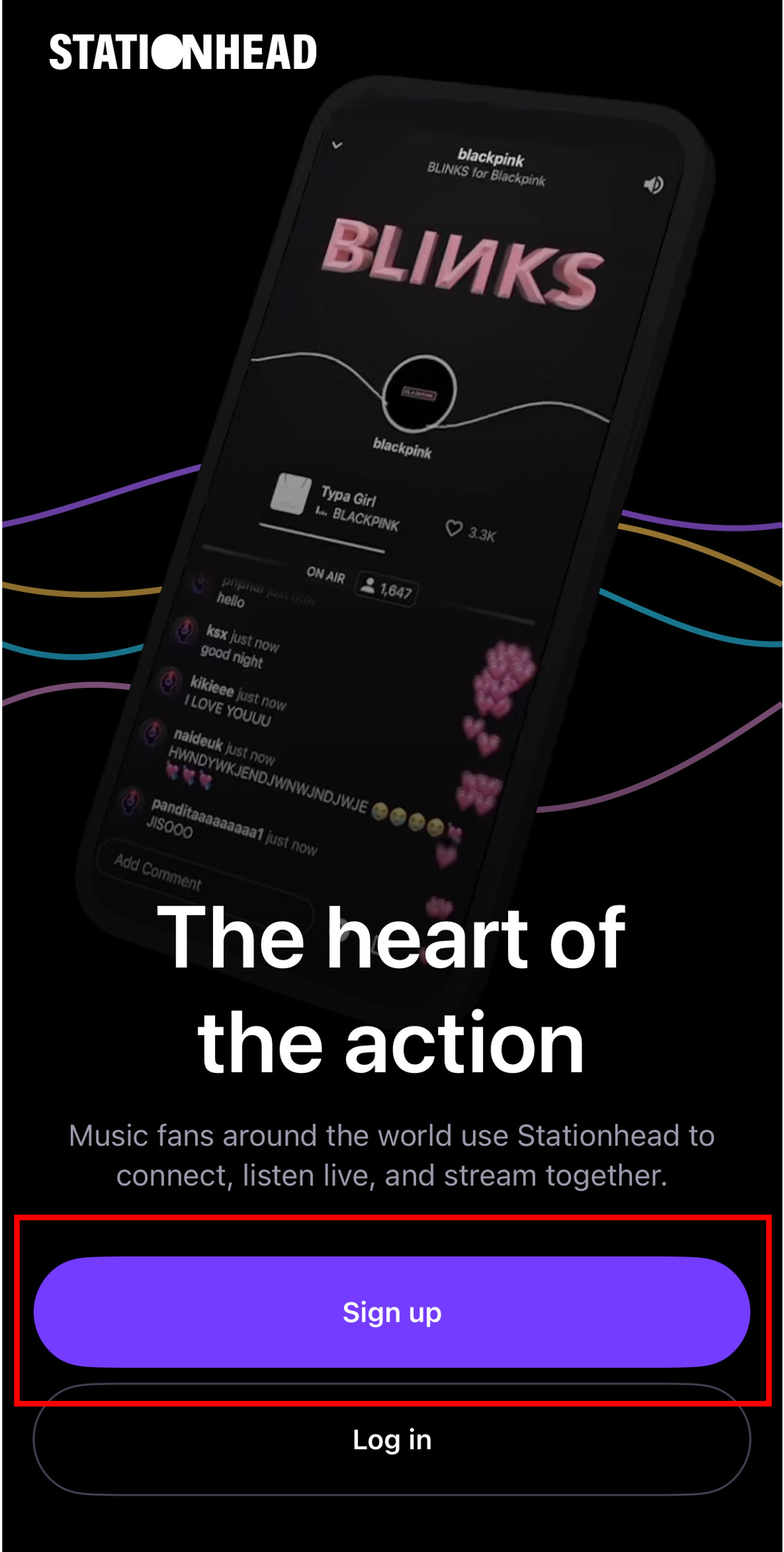 Stationheadのアプリをダウンロードして「Sign up」を選択