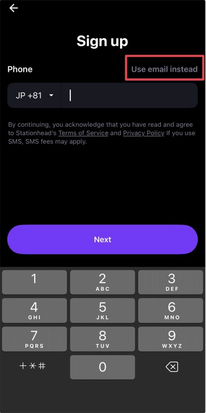 「Use email instead」を選択し、Email欄にメールアドレスを入力ください。